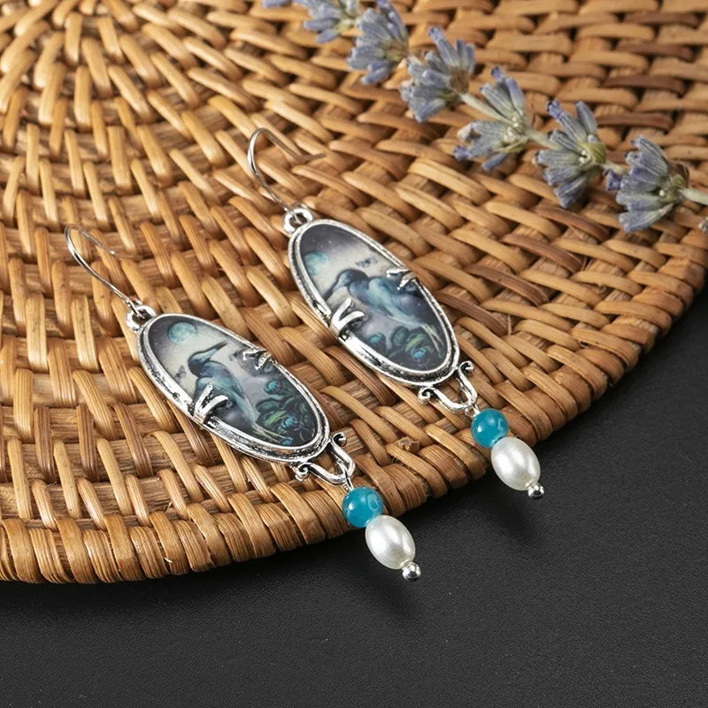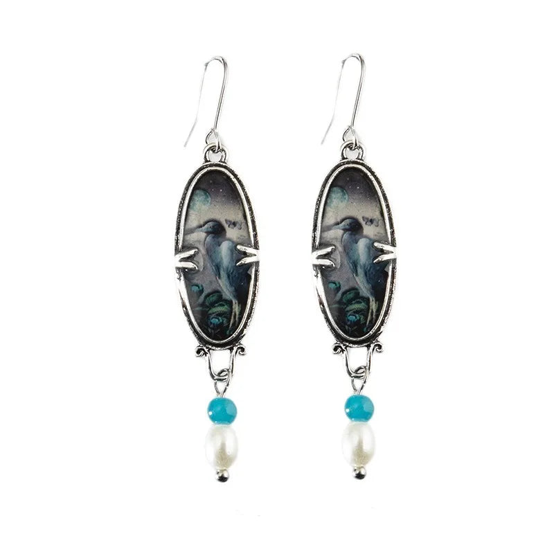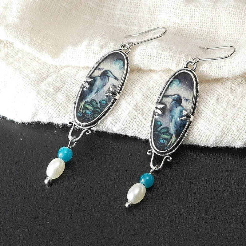 Blue Heron Bird & Floral Pattern Statement Drop Earrings β Pearl & Resin Style Accent ποΈπΈβ¨